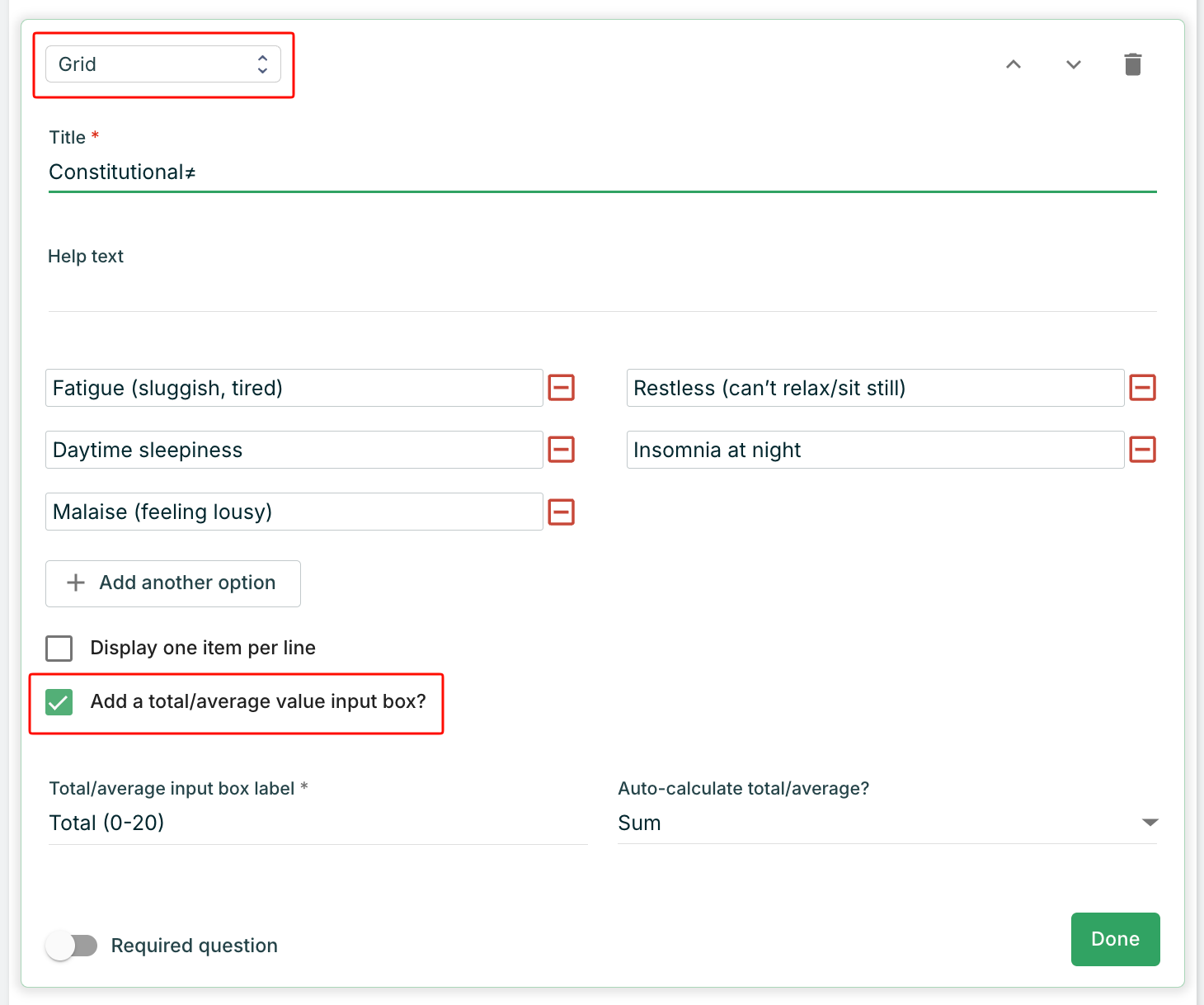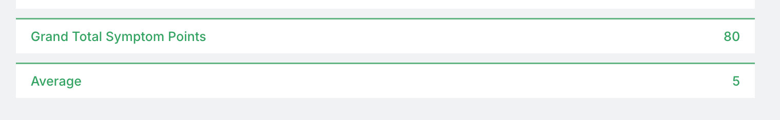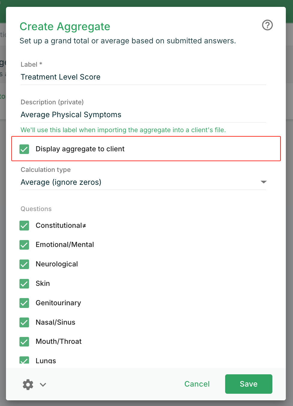 Grand totals and averages — called aggregates — let you automatically calculate a scored result from numeric questions in your forms, giving you meaningful, at-a-glance insight into your clients' responses. Whether you're scoring a symptom questionnaire or tracking a wellness scale, aggregates do the math for you.