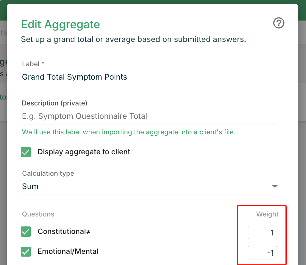 By default, every question carries a weight of 1. If your aggregate requires more advanced scoring — for example, if certain questions should count more heavily, or if you need to subtract one set of scores from another — you can customize each question's weight.