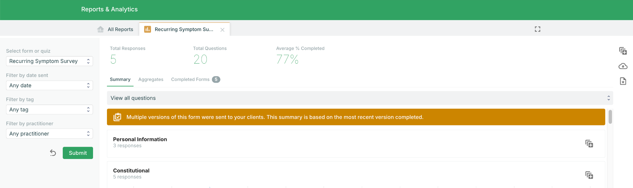This report lets you view and compare responses from different forms over time and across multiple clients, making it a practical tool for tracking trends in your practice.
