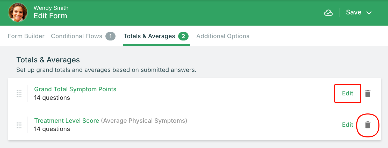 You can edit or delete any aggregate after it has been saved. Return to the Totals & Averages tab of the form, locate the aggregate, and make your changes. Click Edit to make updates, click the Trash icon to delete an aggregate, and use the group of dots to click-and-drag to reorder your aggregates.