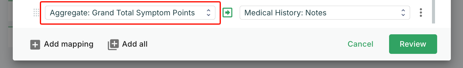 Form Mappings let you automatically pull your clients' form responses into their Client File — and aggregates can be imported the same way. When setting up a mapping, select your aggregate from the Source field of the Mapping popup to map it to the appropriate destination in the client's file, such as Medical History: Notes.
