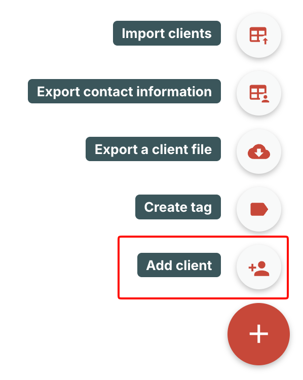 - Click the Fast Action Button (the + icon in the bottom-right corner of your screen) and select Add client.