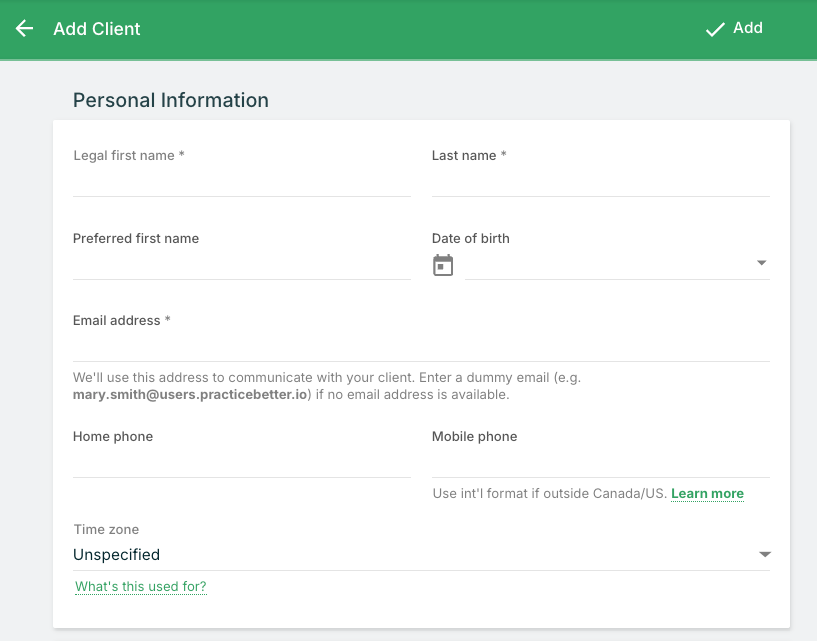 For example, if your practitioner account uses wendy@wendypractitioner.com, you could use wendy.smith@gmail.com for your test client.