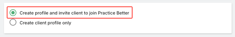 - Select the Create profile and invite client to join Practice Better option.
