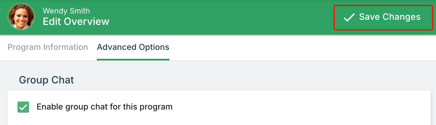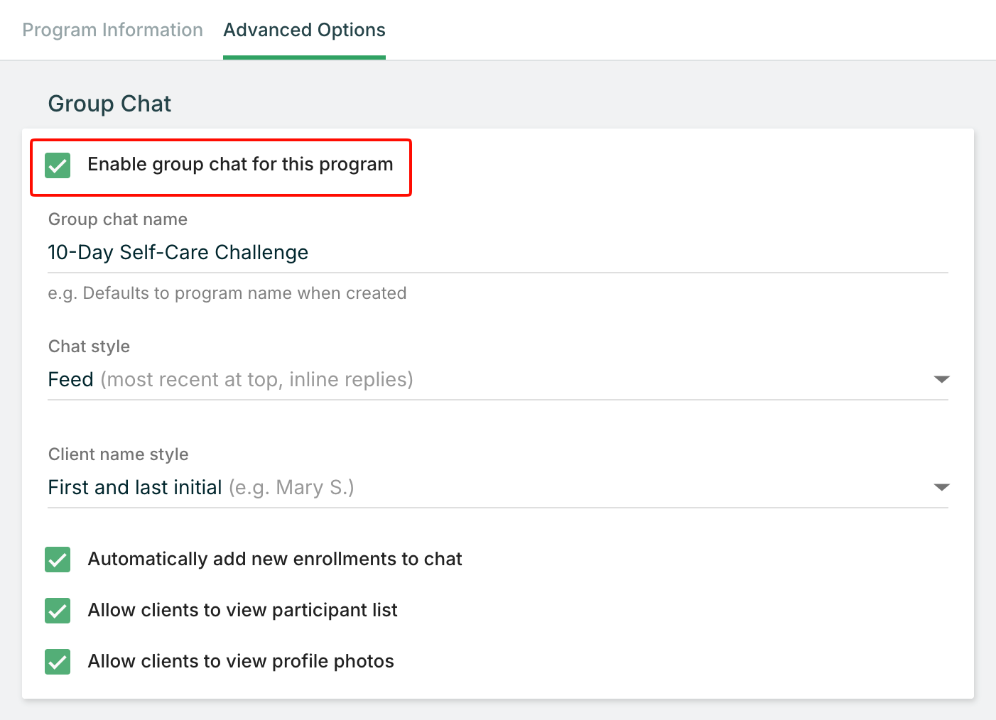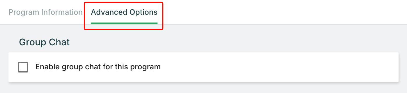- From the program’s Advanced Options page, check the box to Enable group chat for this program.