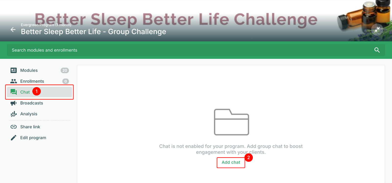 💡 Tip: Use your program chat to celebrate client wins, answer common questions, share additional resources, and foster connections between participants. Your active presence sets the tone for engagement and helps create the supportive atmosphere that makes community-based programs so effective.