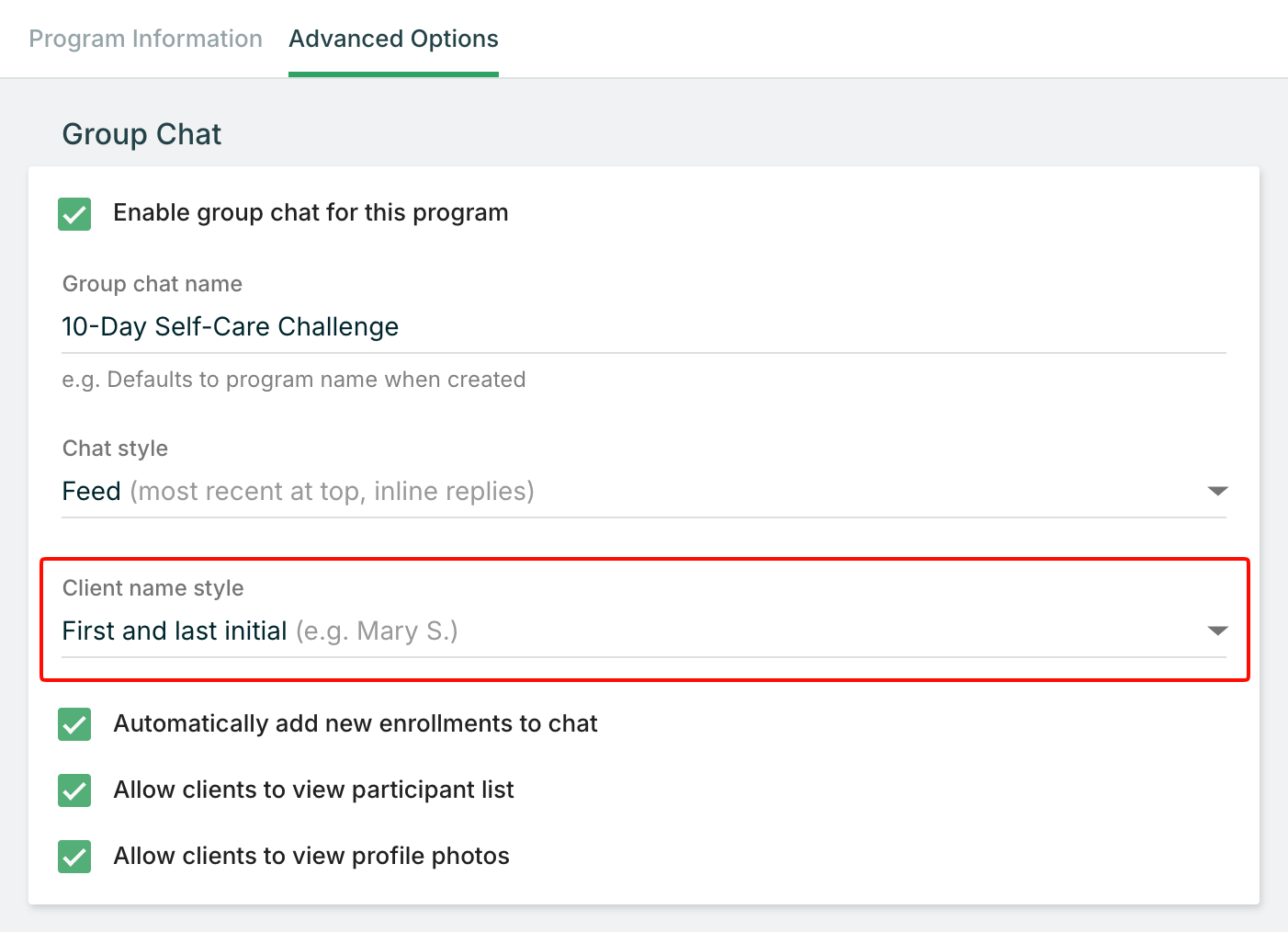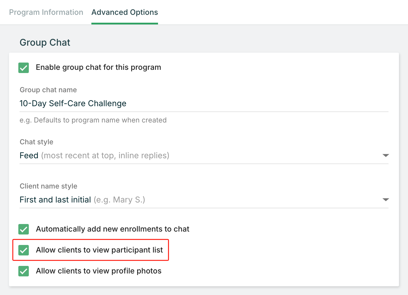 💡 Tip: Automatic enrollment ensures no one misses out on community support. If you disable this setting, you can manually add specific clients to create more selective or curated group experiences (see Adding Participants to Your Program Chat below).