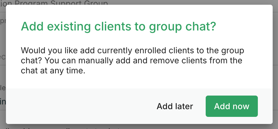 ✅ When you save your new group chat, Practice Better will prompt you to choose whether you want to add currently enrolled clients to the chat. This ensures you have control over who participates from the start, regardless of when you enable the feature.