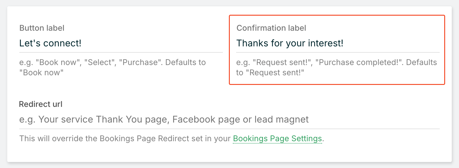 Once saved, your custom button label will appear on your bookings page and in any custom bookings pages you've created, giving your clients a clearer sense of what they're about to do.