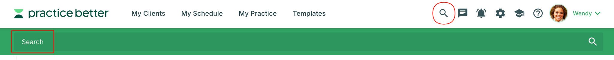 Practice Better's search functionality helps you quickly locate client information, resources, and messages across your practice. Whether you're looking for a specific client, reviewing past notes, or finding a particular form response, search puts everything at your fingertips.