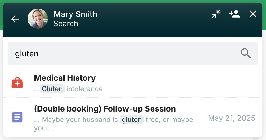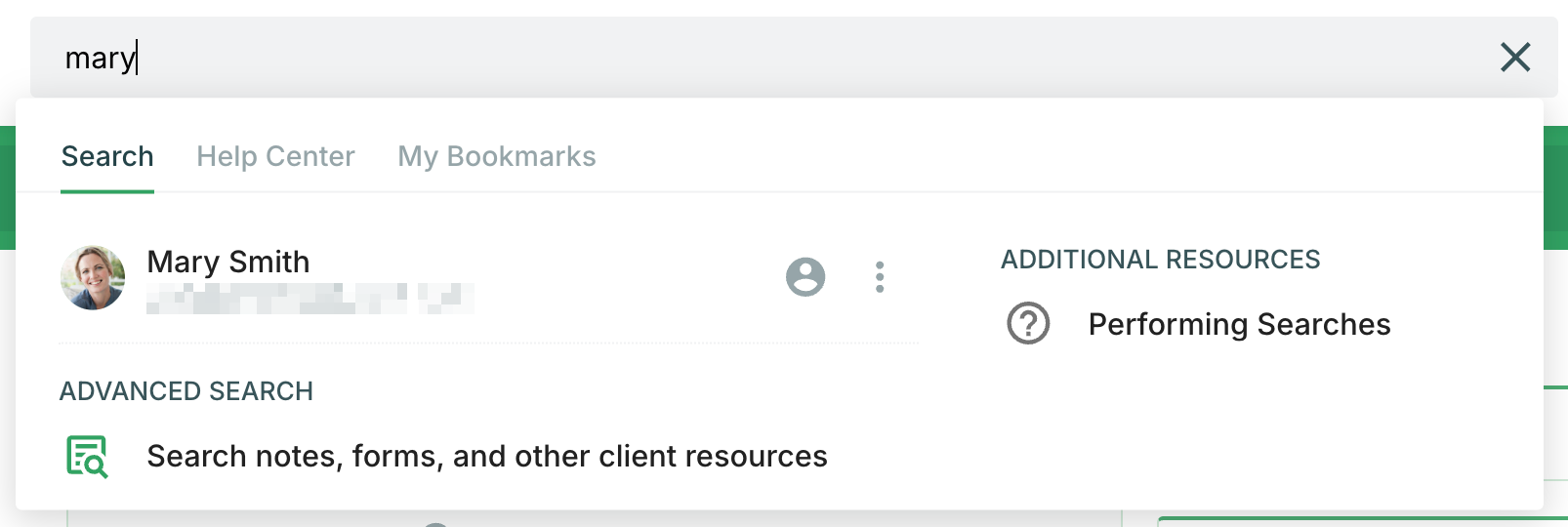 This focused approach searches only within that individual client's data, making it faster to find what you need when you're already working in their chart.
