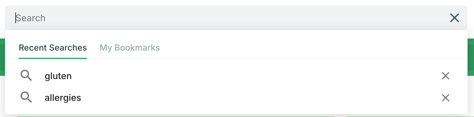 Practice Better remembers your recent searches to save you time. When you click your cursor in the search bar field, you'll see a dropdown displaying your recent search terms. You can click any of these to instantly run that search again, or click the βxβ to remove the terms from your recent search history.