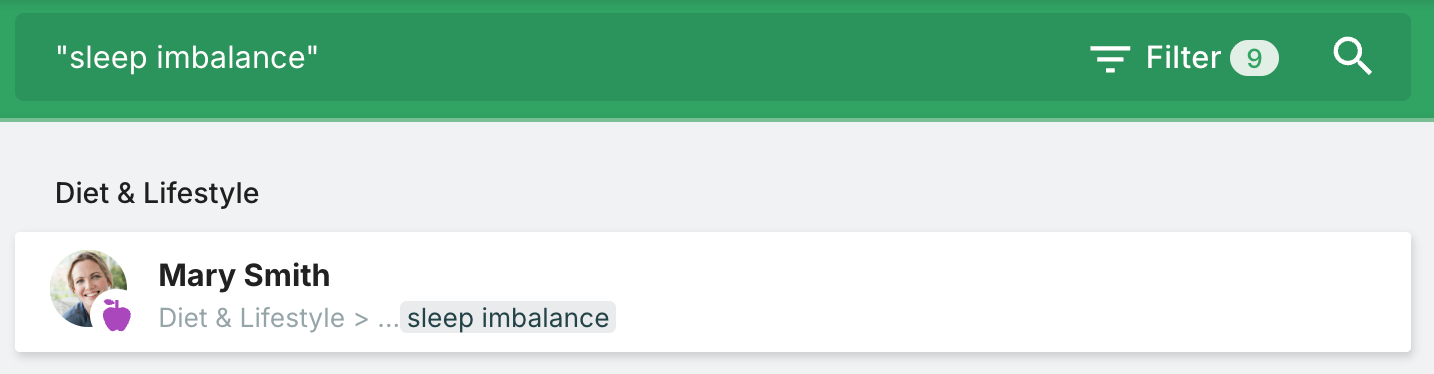 Practice Better's Advanced Search is designed to be flexible and intuitive. By default, when you enter multiple words, the search returns results that contain any of those keywords. For example, searching for sleep imbalance will show results containing either "sleep" or "imbalance" or both.