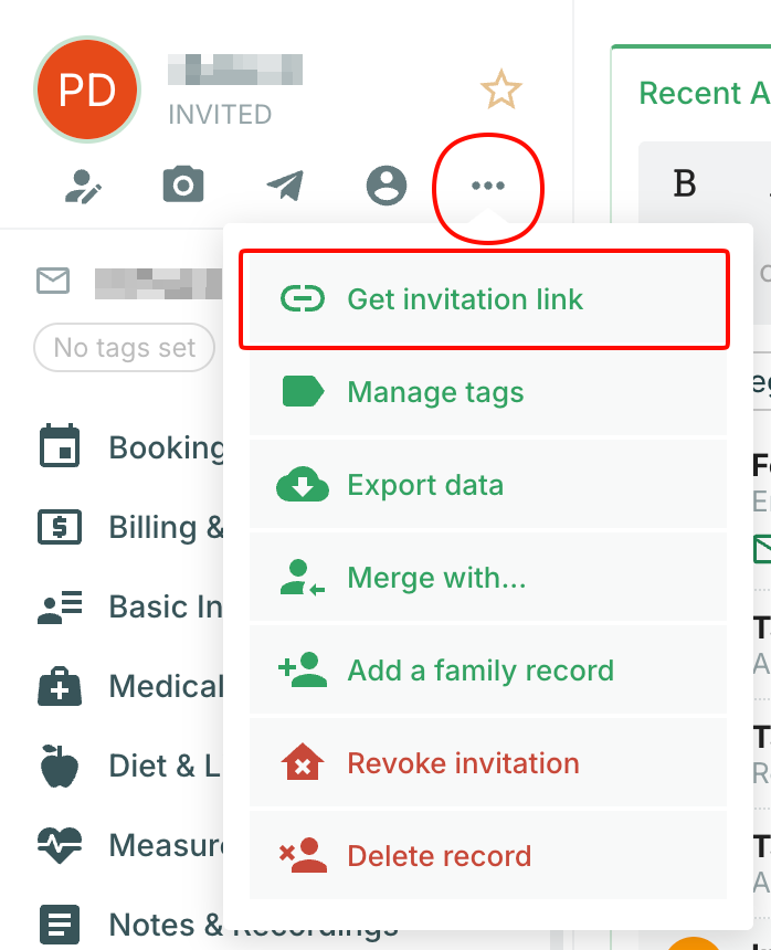 - Or, click the More Options menu (3 dots) near the client's name and select Get Invitation link.