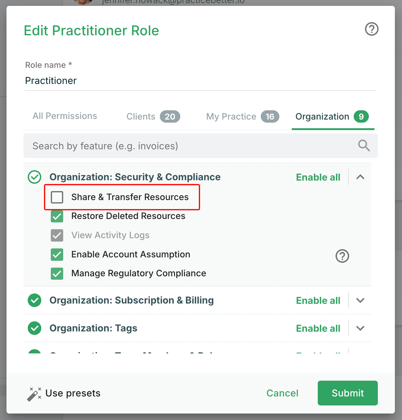 - Locate and expand the settings for Organization: Security & Compliance.