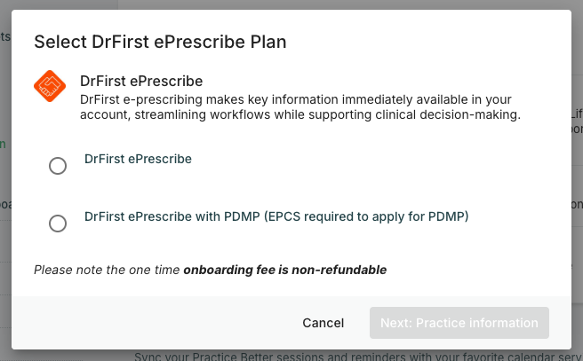 A new DrFirst account will be created for you when you enable the DrFirst ePrescribe integration with Practice Better.