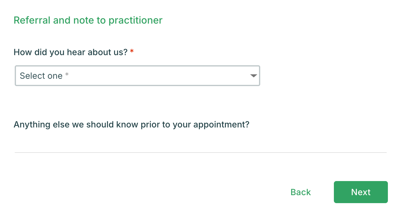 - Provide any required information. Depending on your practitioner’s settings, you may need to complete a Booking Page Form during the scheduling process.