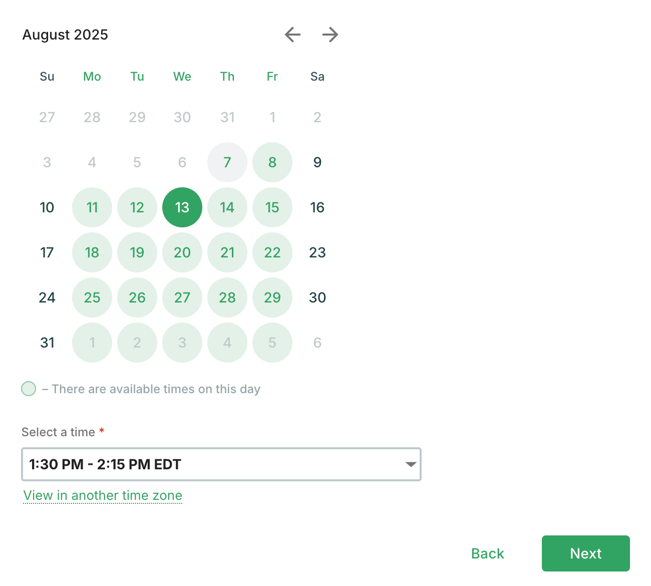 - Select an available date and time slot from your practitioner's calendar and click Next. Available times will be displayed based on your practitioner's set availability.
