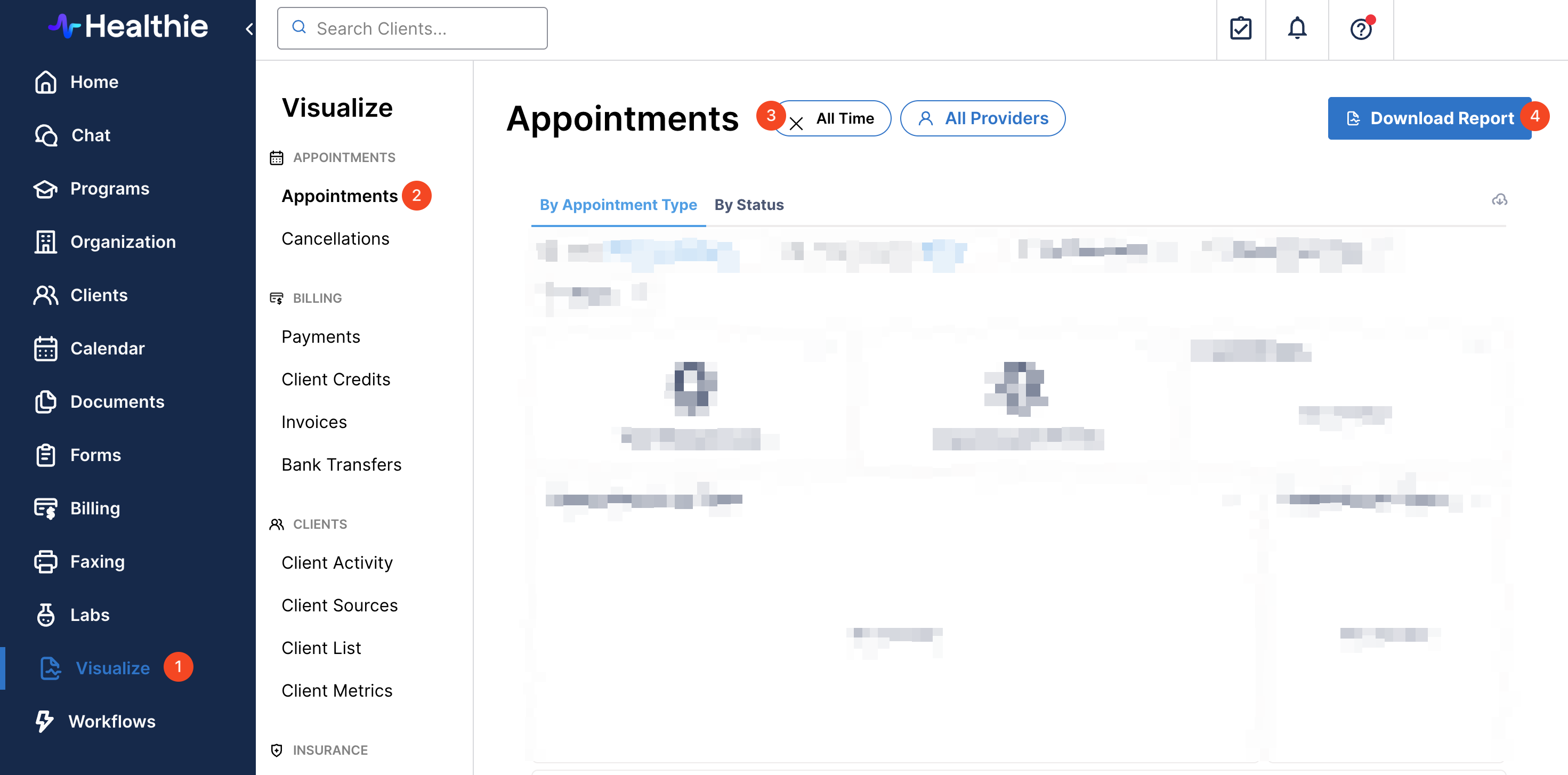 - From your Healthie dashboard, go to Visualize > Appointments.