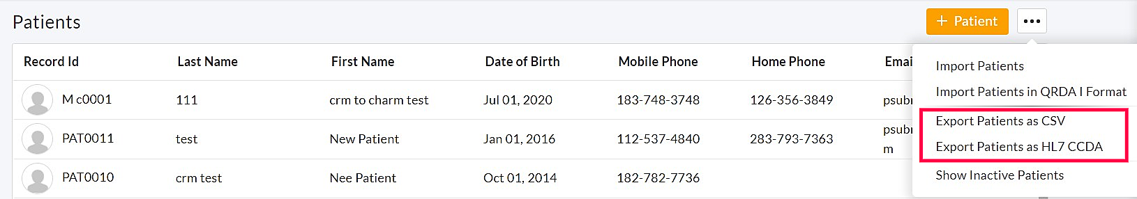 - Select Export Patients as CSV from the dropdown menu.