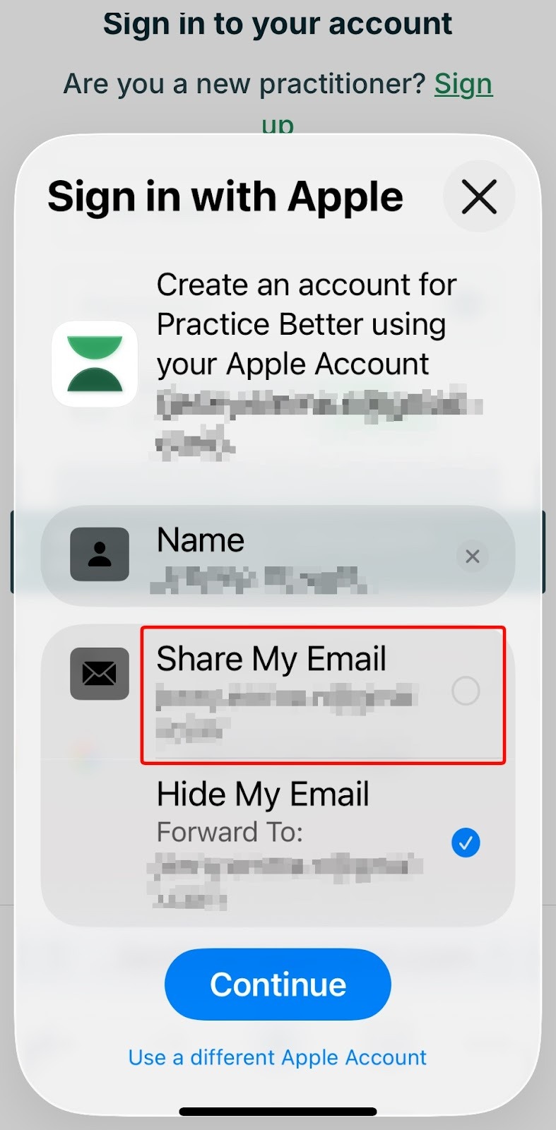⚠️ It’s recommended to select “Share My Email” when you Sign Up with Apple, since we require a valid email address associated with your Practice Better account, for security and privacy reasons. Using your real email address will also help authenticate your account with our support team.