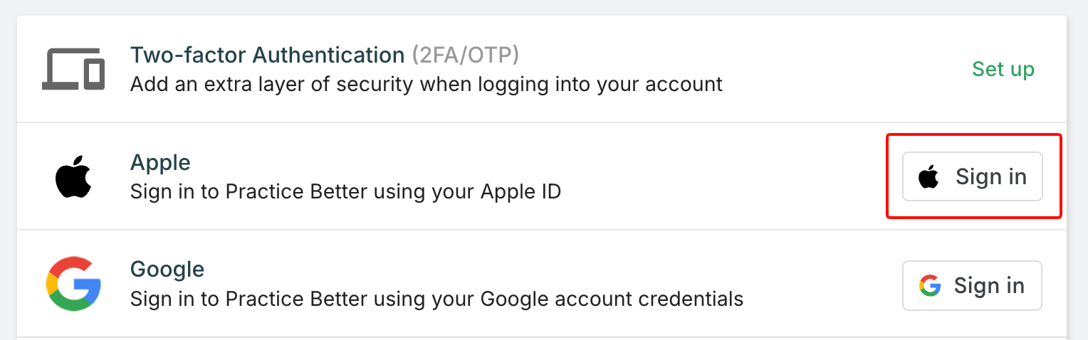 Practice Better supports Sign in with Apple, allowing you to access your account quickly and securely using your Apple ID. This option works alongside traditional email/password login and Google sign-in, giving you flexibility in how you access your practice management tools.