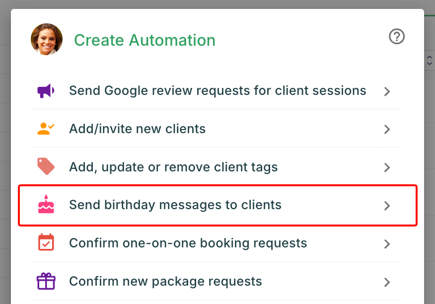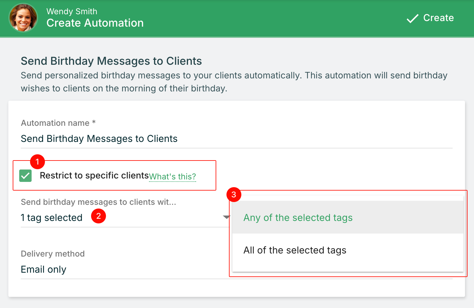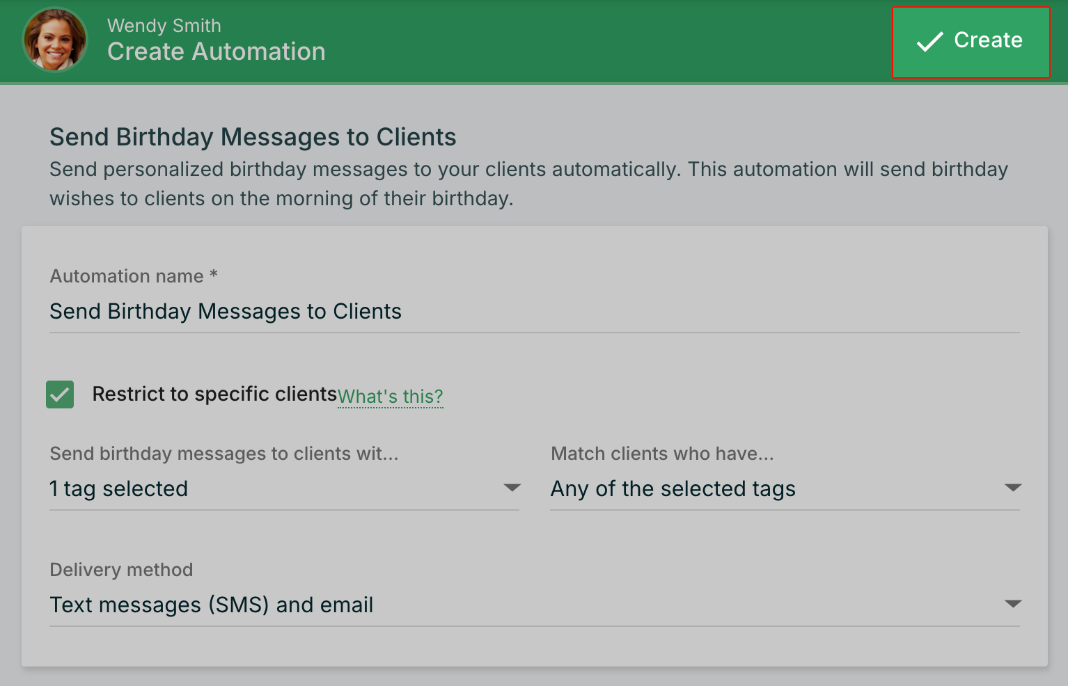 You can send birthday messages to specific segments of your client base by using client tags within your automation setup. This flexibility allows you to create different birthday experiences for various client groups.