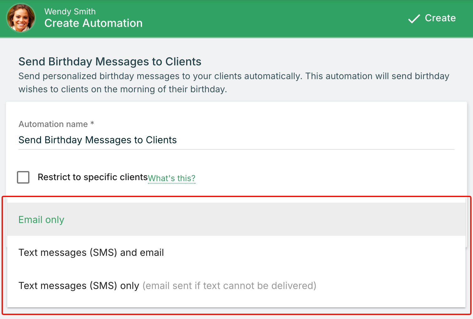 To create an automated birthday message, you'll configure an automation that triggers based on your clients' birthdays.