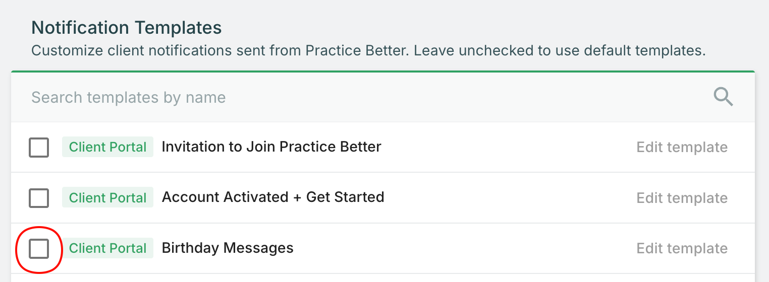 - Locate the Birthday Messages notification template and click the checkbox to edit the template.
