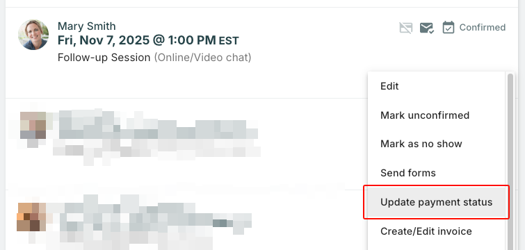 - Click the More Options menu (3 dots) next to the session and select Update payment status from the dropdown menu.