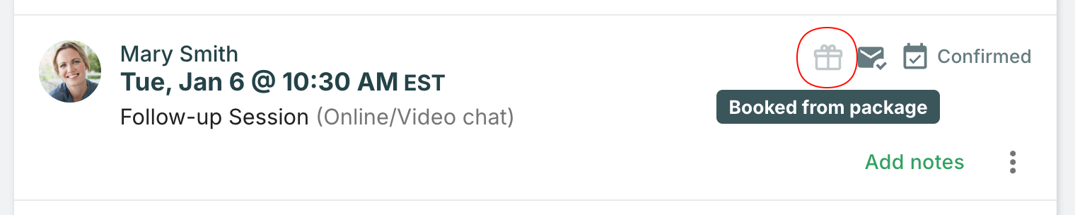 Payment status for sessions booked through a package works a bit differently. When the package's status is Paid, Practice Better assumes all sessions within that Package are already covered by that payment. Because of this, individual Package sessions don't have the option to manually update payment status — the Package payment itself serves as confirmation that those sessions are paid.