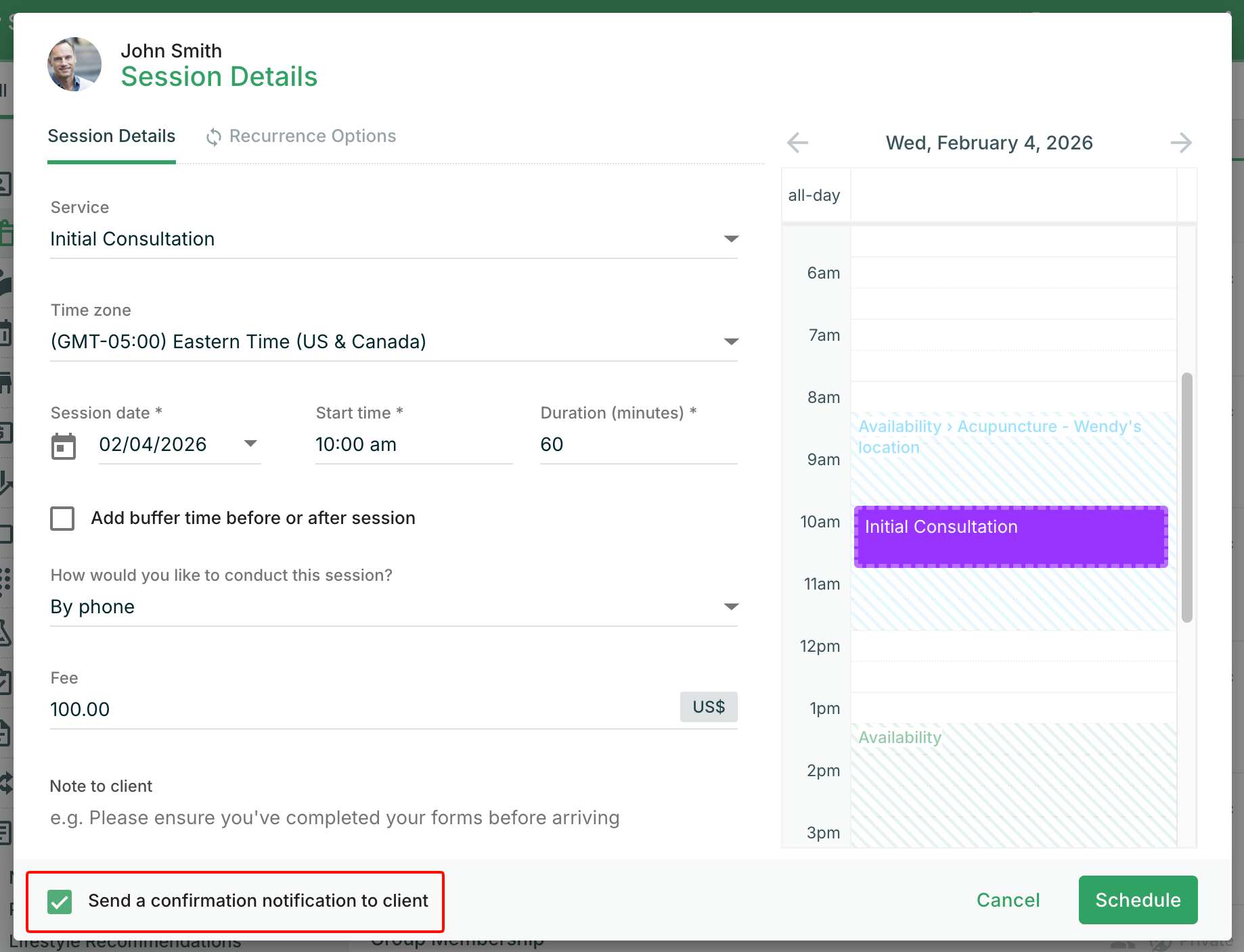 - Complete the booking details in the pop-up, ensure you select to send the client a notification, and click the Schedule button.