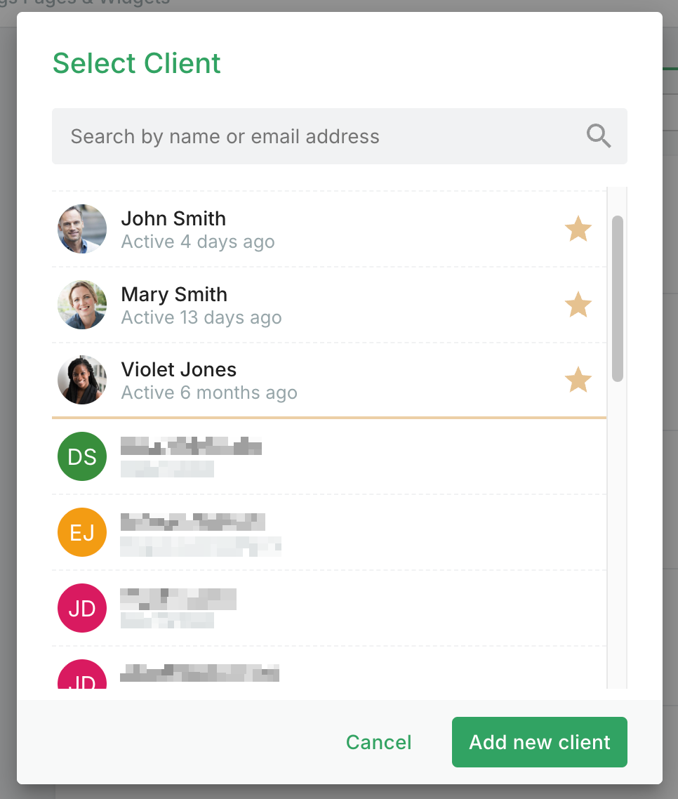 - If you need to create a new client record at this step, complete at a minimum the client's first and last name, and email address.