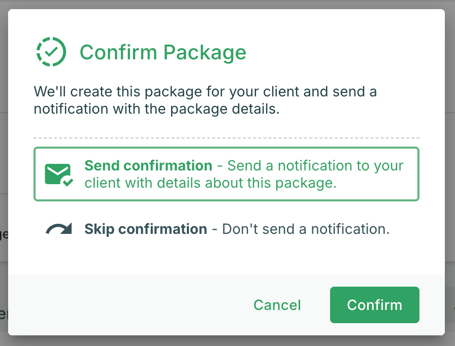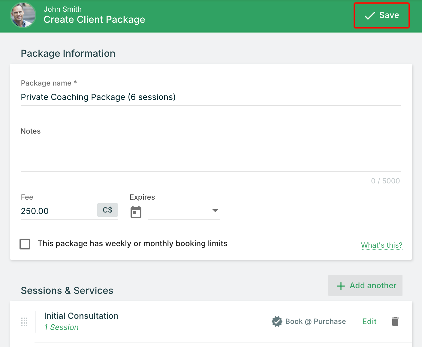 - Verify the Package details are accurate; no changes are required at this step. Click Save near the top-right. This action won't bill the client.