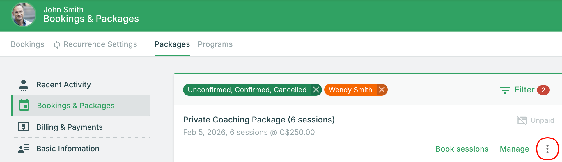 A: You can manually update the payment status of a client's Package from the client's Bookings & Packages section by clicking the More Options menu (3 dots) > Update payment status, just like you would for a session booking.