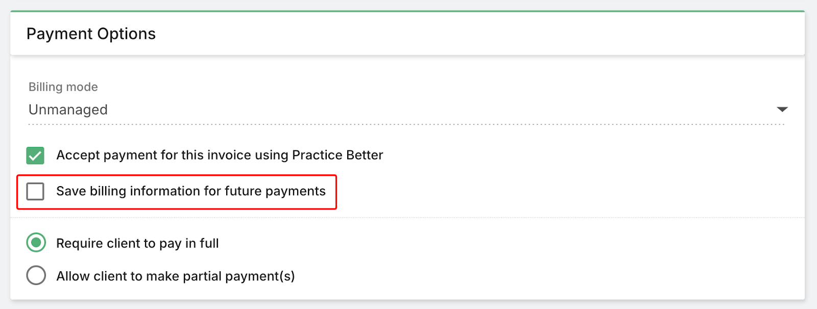 For the best client experience, use either Practice Better's partial payment feature to collect credit card payments OR BNPL with "Pay in Full" — not both together.