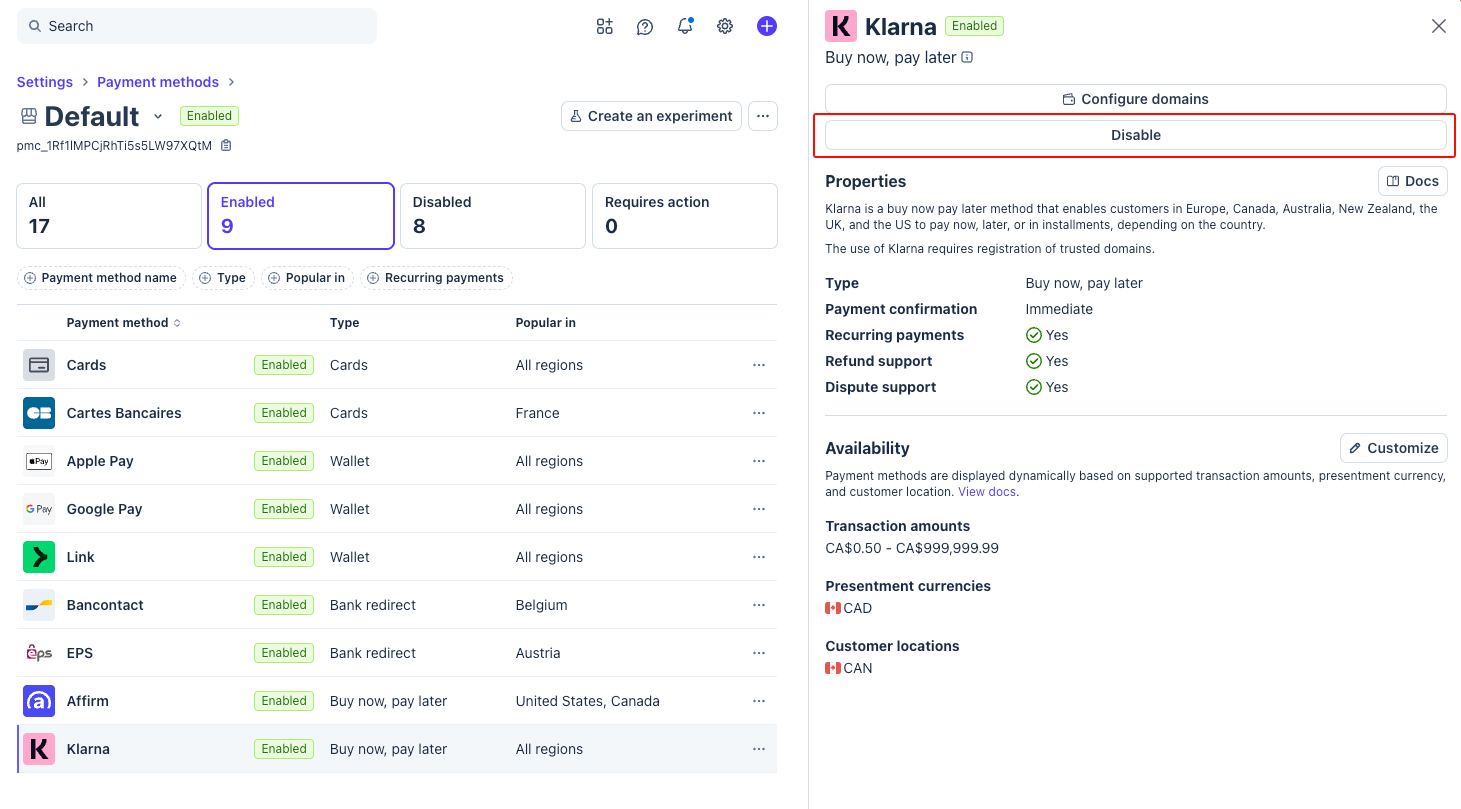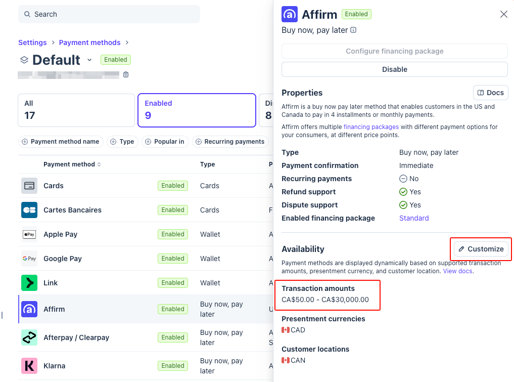 - Click on the payment method name (Klarna, Affirm, or Afterpay).