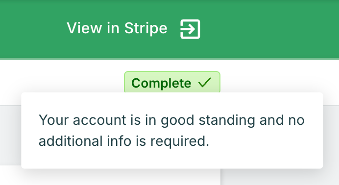 📍 Note: If your account shows "Restricted," "Pending," or "Rejected" status, click View in Stripe from your Payments Dashboard to see what information Stripe needs. Resolving account status issues typically restores full payment method functionality, including BNPL.