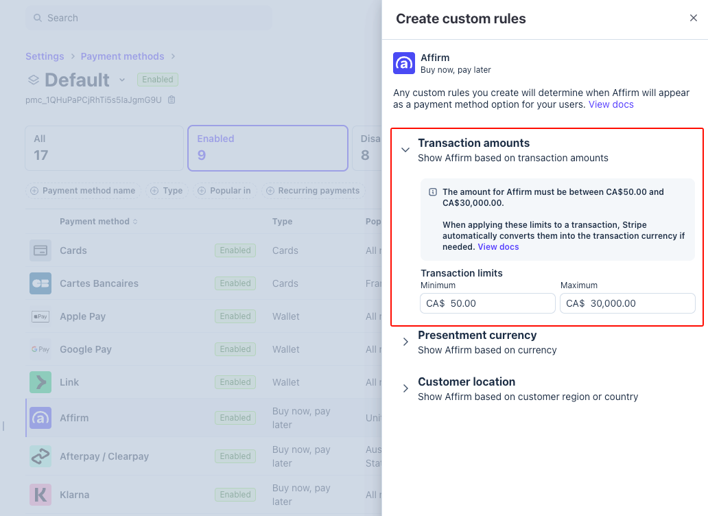 - Note the payment method’s default minimum and maximum amounts, and set them in your rules.