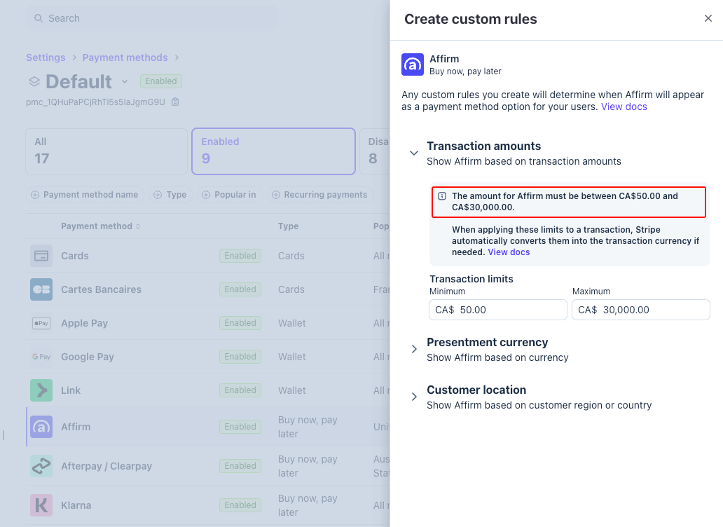 Transaction thresholds determine the minimum and maximum purchase amounts eligible for each BNPL provider. If you've manually adjusted these thresholds in Stripe and set them outside your typical service pricing, BNPL options may not display when you expect them to.