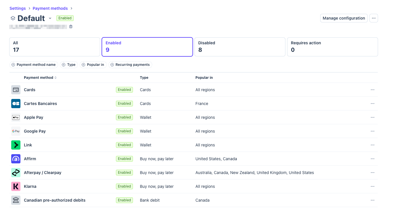 - Click the Enabled filter to see active payment methods.