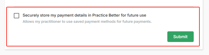 - "Securely store my payment details" client-facing option at checkout