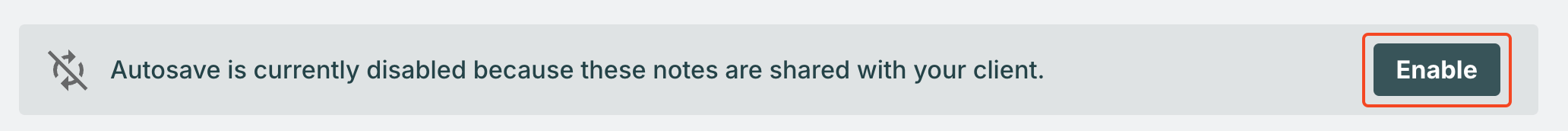 Autosave is disabled by default for resources you've already shared with your clients, e.g. shared notes and published program modules. You'll see the following icon displayed when Autosave is turned off: