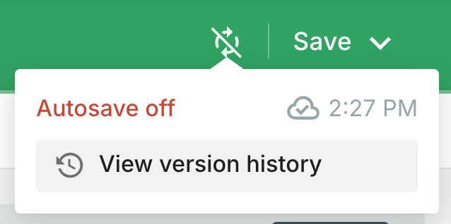 You'll see the Autosave cloud icon in the top-right corner of your screen next to the Save button. Click on this icon to view the last date your work was saved and a button to view a history of changes you've made to the document in the last 60 days.