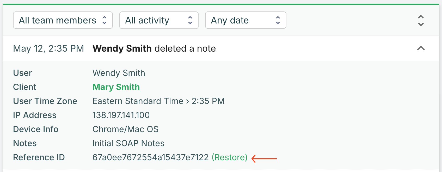 For example, to restore a deleted note, locate and expand the "deleted note" activity entry, then click the Restore button: