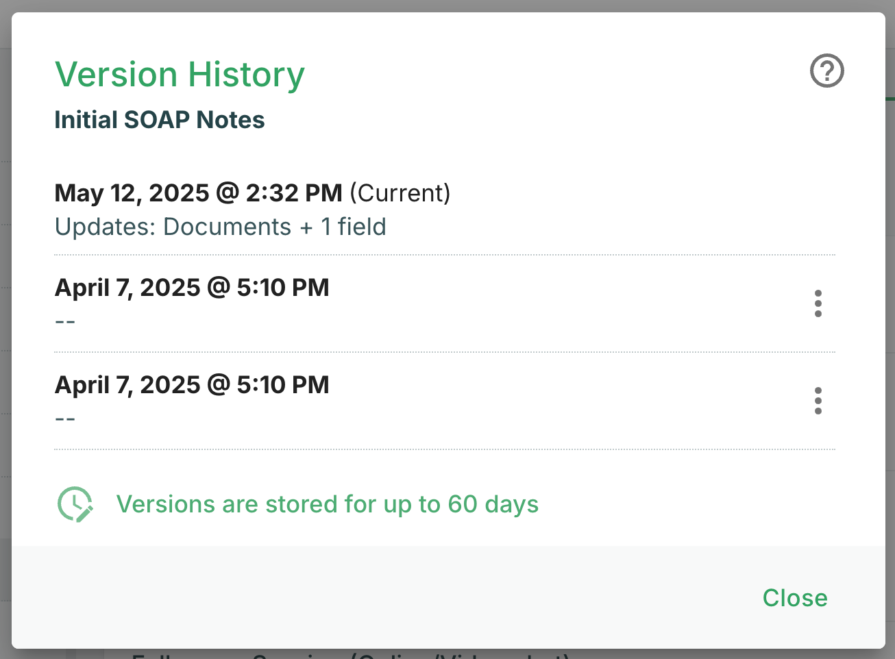 - A list of versions will be displayed, with the most recent version at the top. We store versions for up to 60 days from the current date.